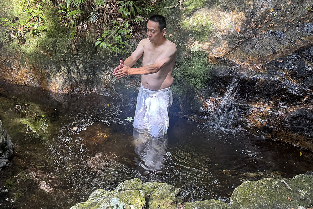 そして、皆で山へ登り滝行を行いました。季節的に涼しくなっており、水は冷たかったのですが、年末の滝行に備えて予行練習を重ねて行いました。