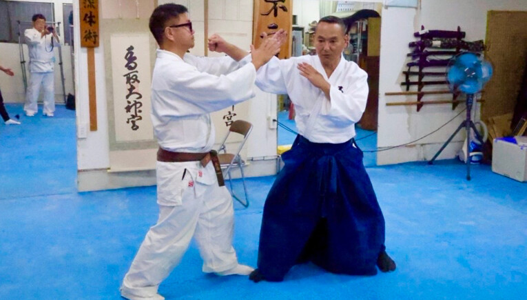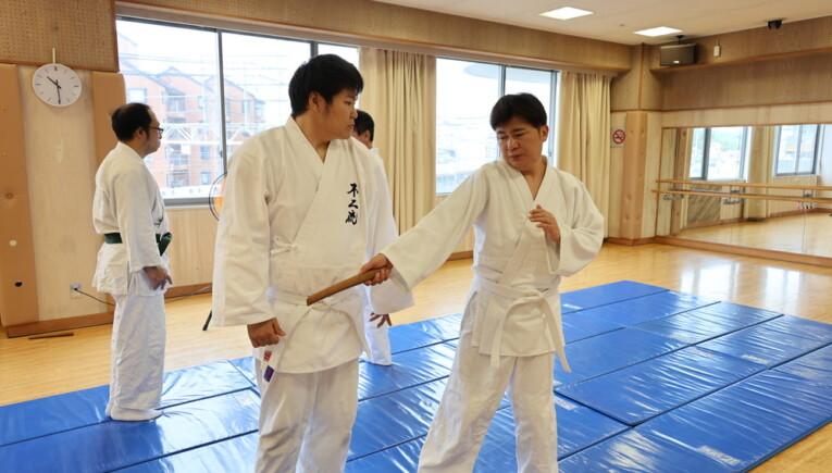 横打ちを防いでから手首を極め、四方投げに繋げる稽古も行いました。