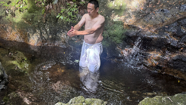 そして、皆で山へ登り滝行を行いました。季節的に涼しくなっており、水は冷たかったのですが、年末の滝行に備えて予行練習を重ねて行いました。